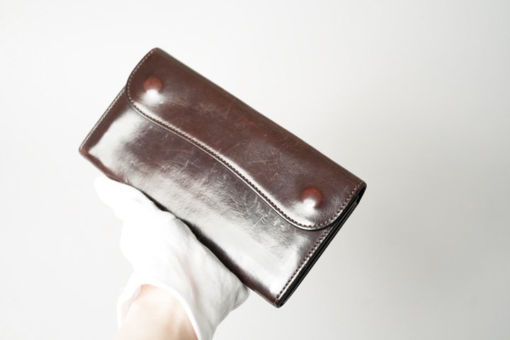 こちらは3年程使用したサドルプルアップ/チョコのWAVEです。サドルプルアップ特有の、膜を張ったような透明感のある光沢が見て取れます。サンプルとして長く展示していた経緯があって紫外線の影響を受けているためか、光沢と相まって元の色よりもワントーン明るくなったようにも見えます。基本的に皮革の色味は使用を重ねるにつれて濃くなることが一般的ですが、使用環境によって変化の度合いは様々で、日光に長時間晒されることで色素が抜けて明るくなったように見える場合もございます。