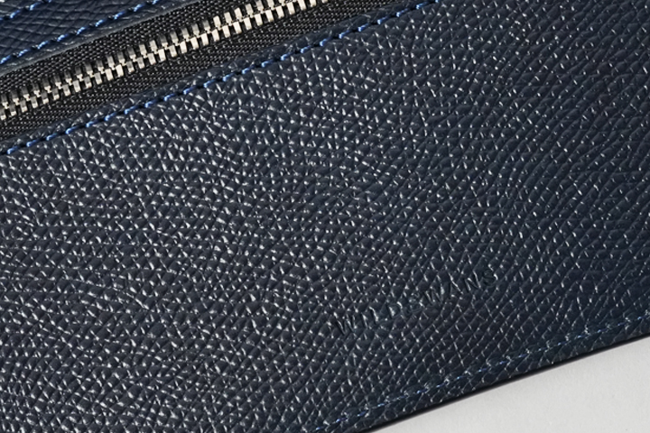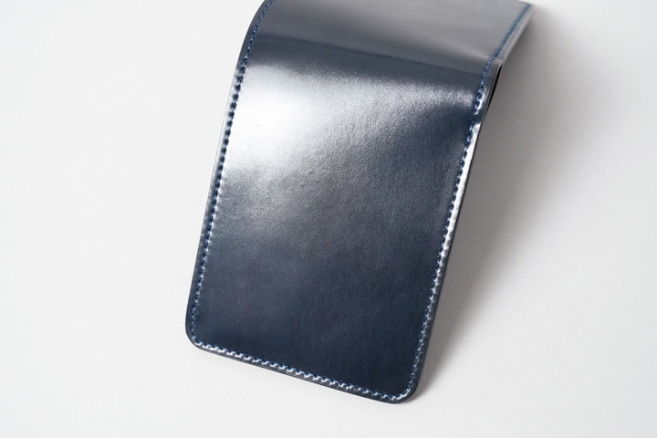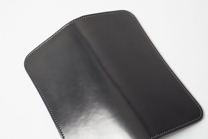 外装はつなぎ目の無い1枚の革を贅沢に使用しています。シェルコードバン特有の色ムラなども確認することが出来ます。