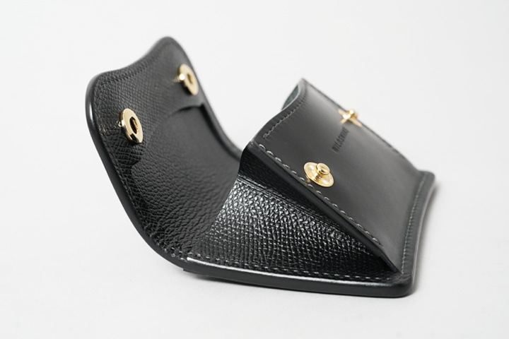 OPTICAL CASEのフラップには1点のホックが設けられています。ホックが1点であることで見た目がスマートになるだけでなく、次の動作へつながりやすいという利点もあります。