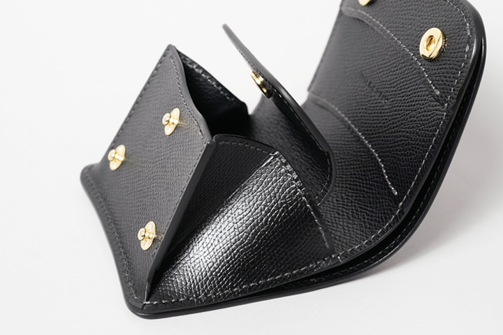 コインケースのファスナーを開くと左側に設けられたマチが開くため、薄型の作りでも視認性や操作性を確保した構造となっています。