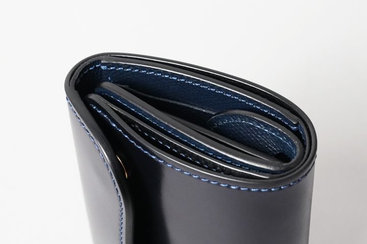 3つ折り財布であるため内部は非常に複雑にパーツが重なり合っています。それゆえ側面を覗くと革が年輪のように蓄積している様が見えます。