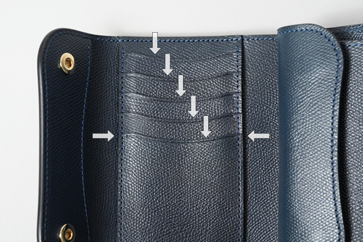 カードポケットは画像の矢印のように7つのポケットが重なるように配置されています。コンパクトに収めるために非常に効率的な構造をしています。