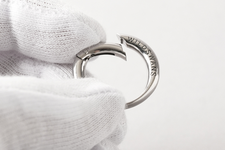 表面にはWILDSWANSのロゴが刻印されており、またリングの一部はバネ式のゲートになっています。