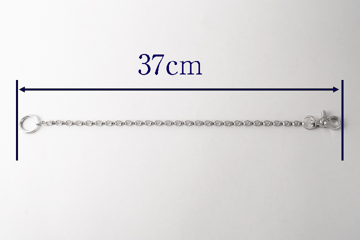 このチェーンに先ほどご紹介いたしましたラウンドカラビナとTRIGGER SNAPを接続したセットがWALLET CHAINです。カラビナの先からスナップの先までの全長が37cmのサイズとなっています。