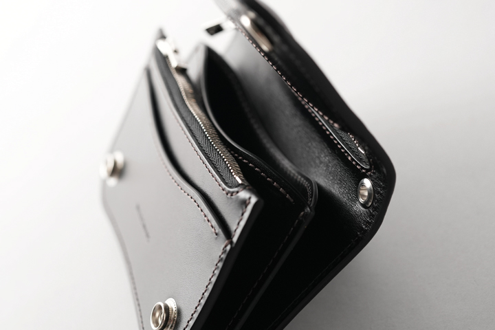 武骨で存在感のある人気のモデルにウォレットチェーン用のハトメを取り付けました。外装、内装にはサドルプルアップのブラックを使用しています。