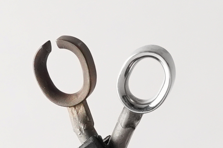 ご参考までにこちらの画像をご覧下さい。 画像の左側がリングの形に成形されたのみで研磨前の状態のコマです。大きさは8mm程度の小さなコマを右のような輝きを帯びるまで磨き込むのですが、小さなコマ1つ1つを手作業で入念に磨き込み、コマとコマを繋いで溶接した後にも更に磨いた上で、完全に継ぎ目が無い状態に仕上げられています。