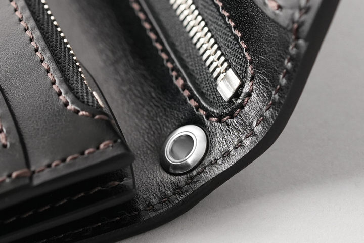 迫力のある4層のコバや、いかにも頑丈そうなフォルムながら分類上は小型のウォレットに位置します。