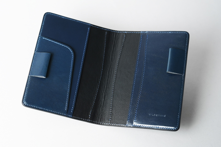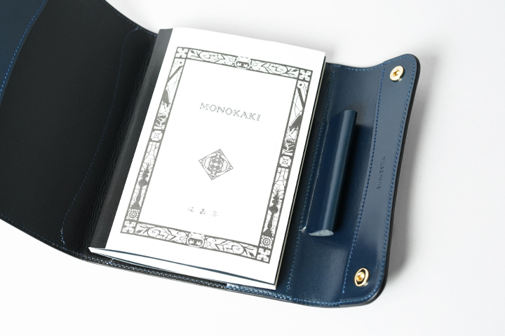 内装は金具の無い総革仕様です。ノートの表紙と裏表紙を差し込むパーツの他に、ペンホルダー、栞やメモを保管できる収納部を設けています。ノートや本が干渉する部分には型押し牛革を使用しており、出し入れの際に傷が付きにくいというメリットがあります。