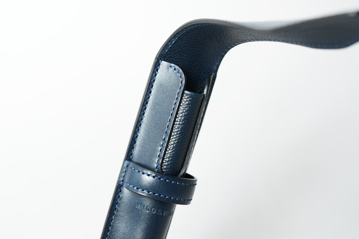 アーチ状の革のループからフラップをスライドして開閉します。