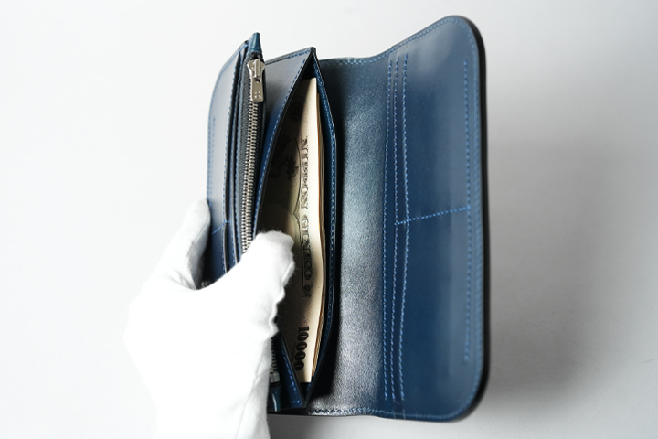 BLISTER-Lの特徴は、財布とは思えない重厚感を持つコバです。大型のファスナー付きコインケース、カード段、マチなしポケット、船形に開く札室を持つ構造のため、片側は蛇腹のような見た目をしています。