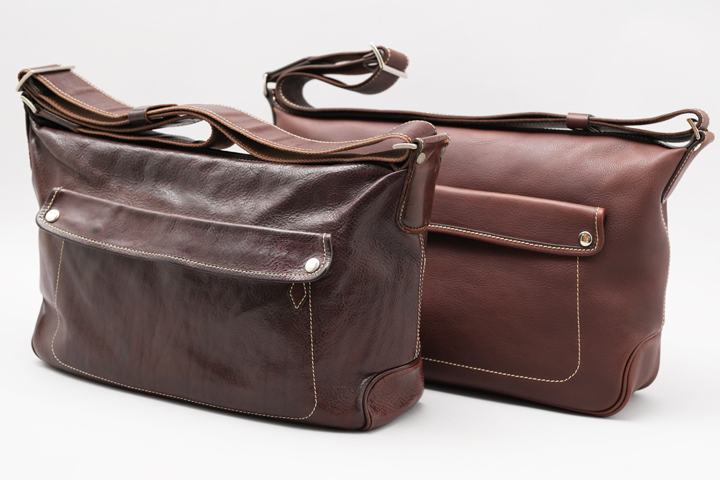 画像の2点は同じミネルバボックスのタバコカラーを使用したパパスショルダーですが、スタッフが使用している左側は色味が深まり、また全体に光沢を帯びることでアンティーク感や迫力に満ちた佇まいへと変化しています。