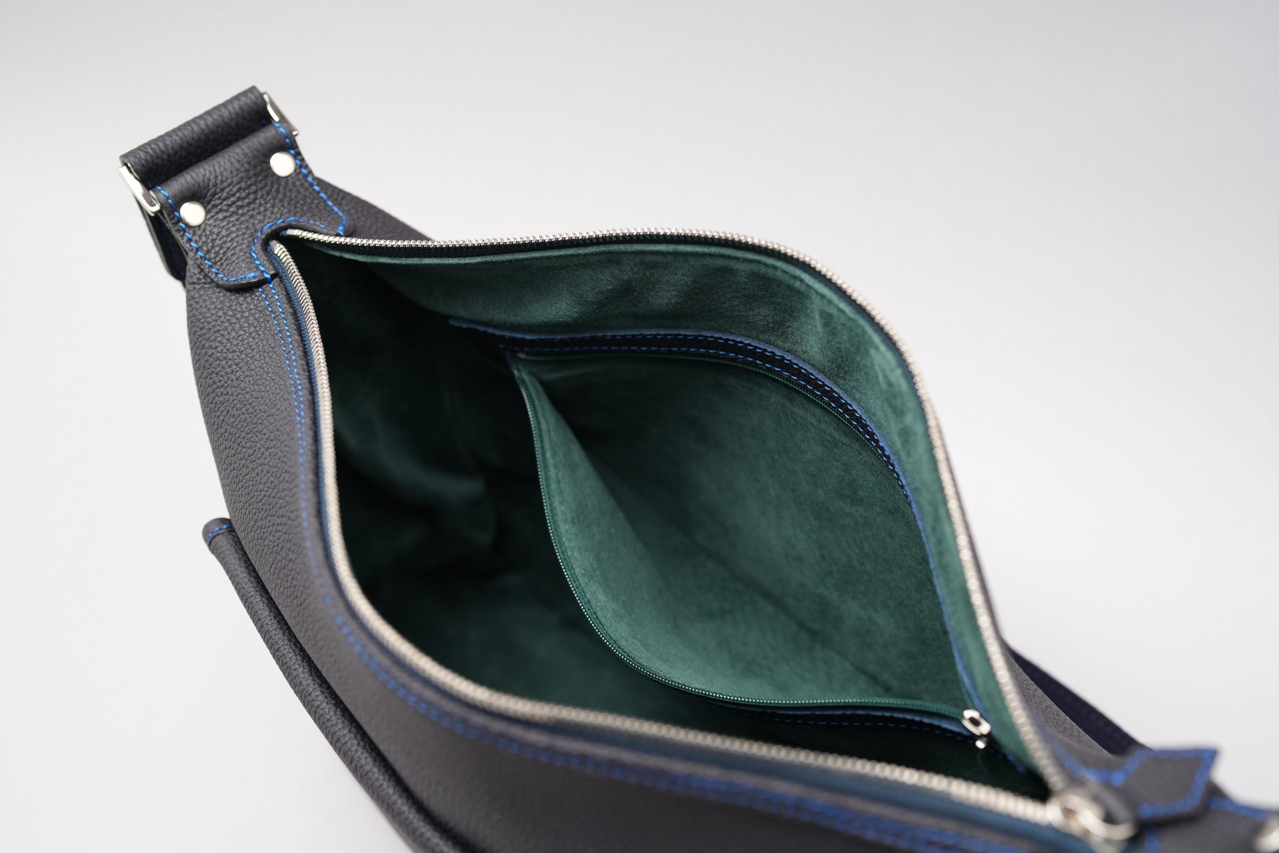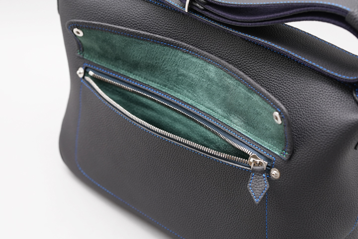 本体の正面にはフラップが付属し、開くとファスナー式の横長のポケットが現れます。 フラップとポケット内部に何気なくあしらわれているのは生地ではなくピッグスエード(起毛させた豚革)です。つまり外装、内装に皮革を使用したフルレザー仕様という、なんとも豪華な作りになっています。