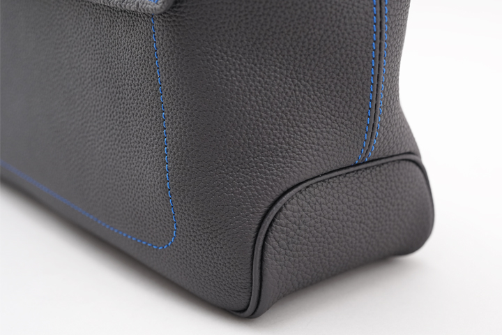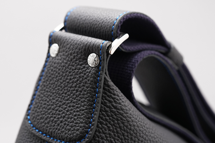 ショルダーストラップは幅5cm程と広めで荷物が重くなっても肩に食い込まず、ベルトの片面には本体と同じ皮革を使用した高級感のある仕様です。バックルによってストラップ長は無段階調節が可能なため、幅広い方にお使い頂くことが出来ます。 肩に当たる部分には生地テープを用いることで滑り止めと汗や強い摩擦による移染の防止の役割を果たしています。