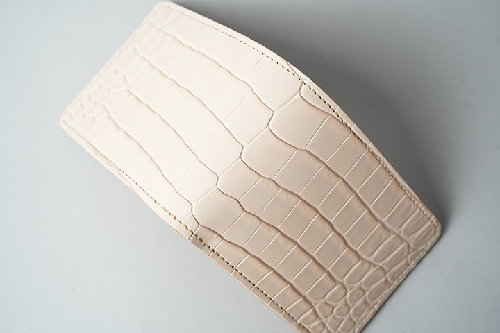 今回のヌメクロコで使用するのは、WILDSWANSの定番クロコシリーズと同じナイルクロコです。名前の通り、主にアフリカ大陸周辺に生息するクロコダイルの一種で、比較的鱗が大きく、その並びがきれいなことも特徴です。近年は動物愛護などの観点から、それまでクロコダイルを使用してきた大手メゾンでもその使用を取りやめることがあり、今後の供給における不確実性が一層高まっています。