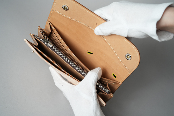 例1)上の画像では、TONGUEの内装にある革の仕切りである「ベロパーツ」の跡を掲載しています。