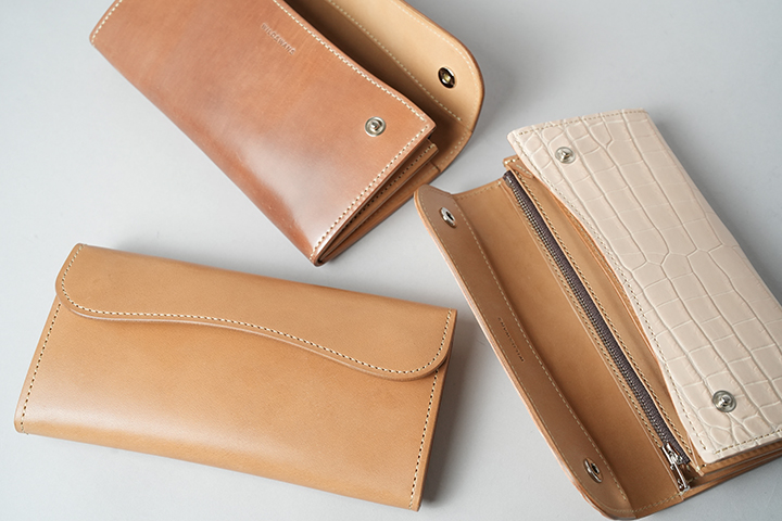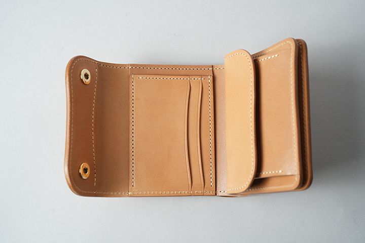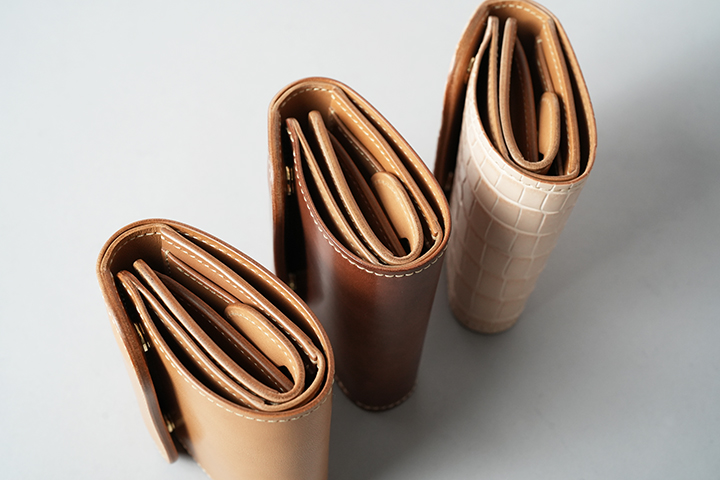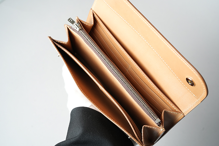しかし、他のヌメ革と比較した場合、バスタン&フィスはサドルプルアップも凌ぐほどの非常に強いハリ感を持ち合せています。さらに手に吸い付くようなしっとりとした手触りは、革小物として直接手にして頂くことでその価値がさらに高まります。2024初売りの際は、内装や裏貼りにサドルプルアップのナチュラルを組み合わせていましたが、今回は内装や裏貼りも含めすべての皮革使用箇所にバスタン&フィスを用いる「“フル“バスタン&フィス」バージョンでの登場です。