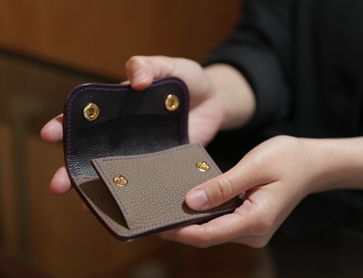 コインケースの両脇には、上部が大きく開く中折れのマチが備えられています。収納部が大きく開き、収納した物の出し入れを容易に行うことが出来ます。