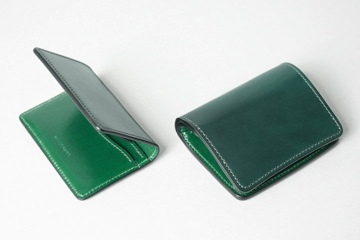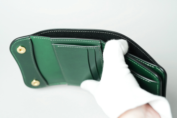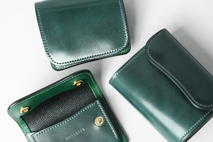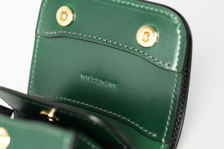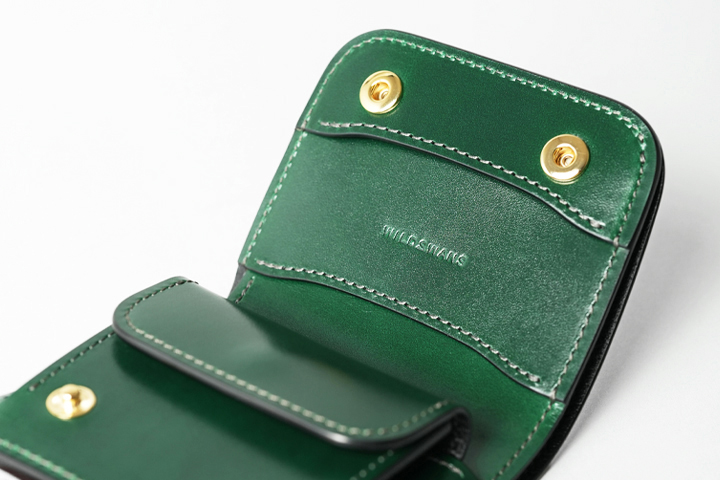 フラップを開けば、シェルコードバンに刻印されたWILDSWANSのロゴ、鮮やかなサドルプルアップの細かなパーツが現れ、異なる素材のグリーンを同時に目にすることができます。