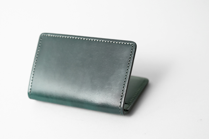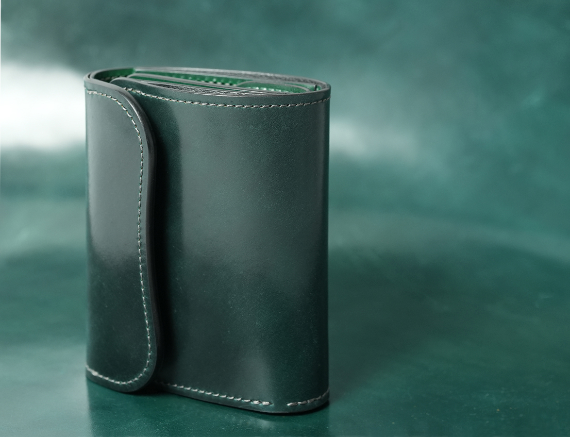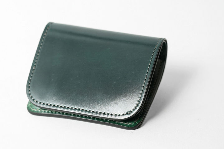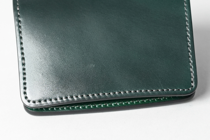 アメリカ・ホーウィン社は最高級シェルコードバンを造る老舗のタンナーです。馬の臀部の内部にある「コードバン層」という高密度の繊維の集まりであることから、牛革と比べると折り曲げに強くしわが発生しにくいという特徴があります。 シェルコードバンのグリーンはクロコダイルのハンターグリーンとはまた違った落ち着きがあります。 特有の色ムラや柔らかな艶感に加え、曇り、繊維のざらつき、ピンホールなどが存在しますが、これらは革の風合いを損ねない自然な仕上げを施している証拠です。長年使い込むほどに起き上がっていた繊維は寝て滑らかな質感になり、新品時よりも透明度が増す美しい艶感を楽しむことができる、育てがいのある素材なのです。