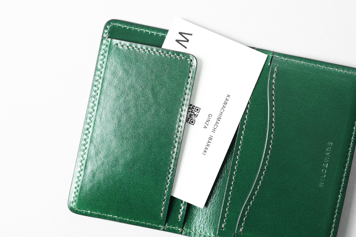 kf-003にはコラボレーションの証としてダブルネームの刻印を施しています。こちらもロゴパーツ部分は収納部としての機能はありませんのでご注意くださいませ。カードの破損や、革が縫製に沿って裂けてしまう恐れがあります。