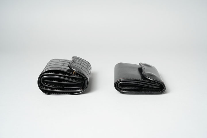 札室は本体のサイドに設けています。ENOはコンパクトとはいえ三つ折りの構造により札室部分ゆとりを持って収納が可能です。なお、この部分には型押しの牛革をあしらっています。札室の収納の目安としてENOには約28枚の一万円札が収納できます。