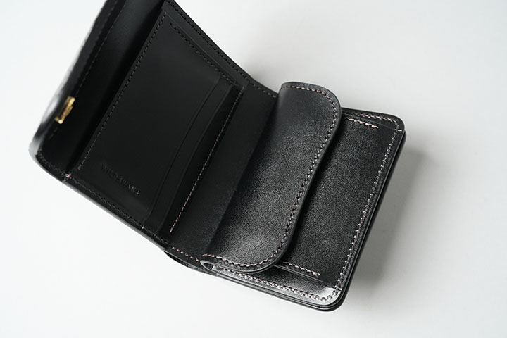 中央部分のコインケースには左右または上から合計5枚のカードの収納が可能です。カード段ポケットの奥のスペースは左右で独立した収納部になっているため、左右それぞれから収納したカードは干渉しない仕組みになります。また、WILDSWANSのロゴはこのカード収納部に刻印されています。