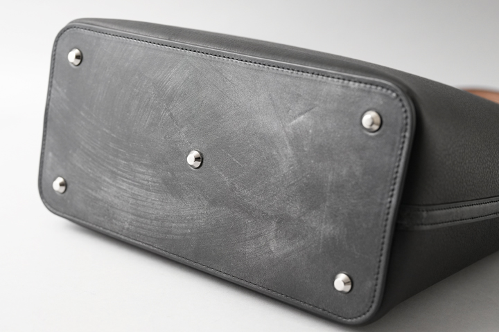 厚み4mm超のフルグレインブライドルレザーに芯材を仕込み、胴部分に縫製されています。底革+胴パーツとこちらも相当な厚みになりますが、美しく、且つ強固に縫製されています。 また底部分の四隅と中央には底鋲が取り付けられており、床置きの際にも安心です。