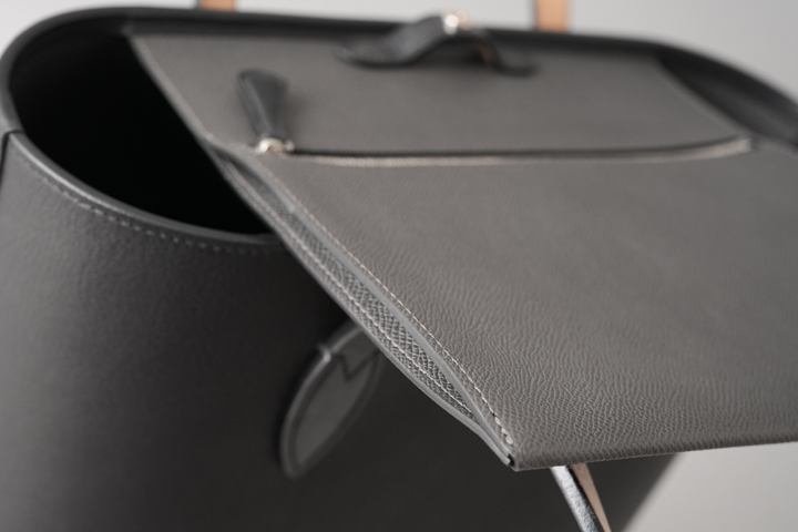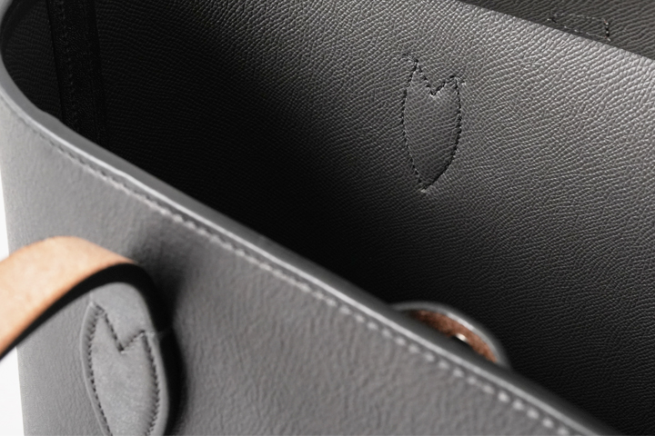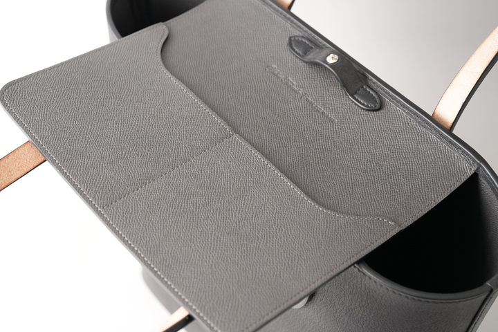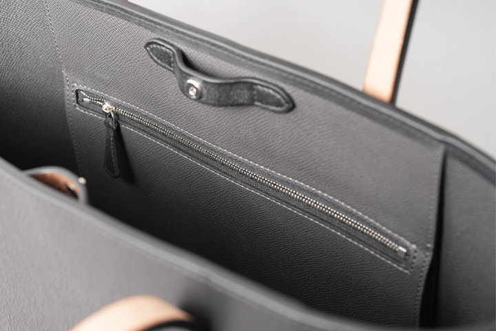 内装素材にはフランス・HAAS社の型押しの牛革、ダービーを使用しています。 品のある細かなシボと発色の良さが特徴のクロム鞣しのカーフ、ダービーは某大手メゾンにも供される上質な皮革で、適度なハリを持ち、傷が付きにくく付いても目立たないというユーザビリティの高い素材です。 カラーはグラファイト(黒鉛)という濃いグレーを使用しており、外装に使用されたブラックの皮革との変化を付けています。