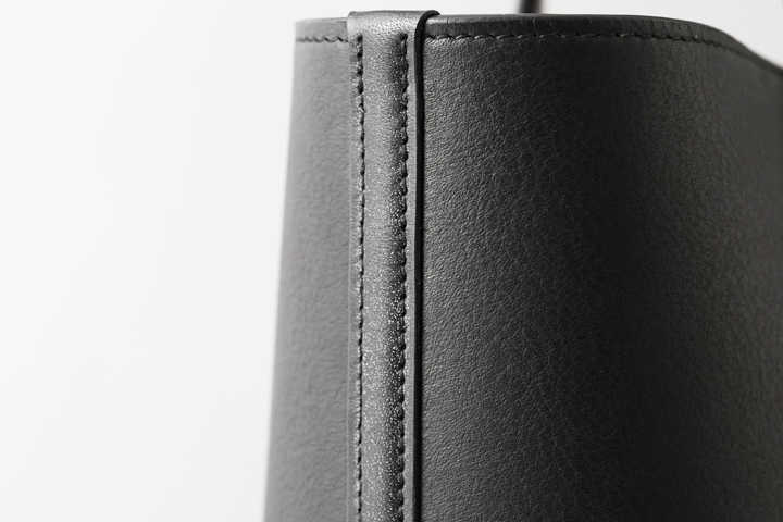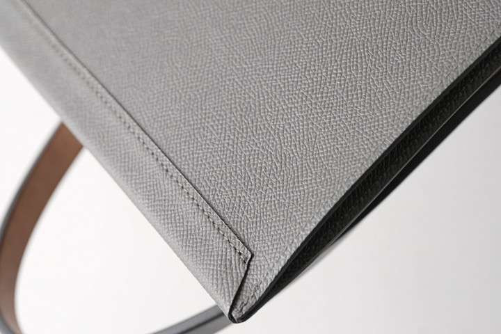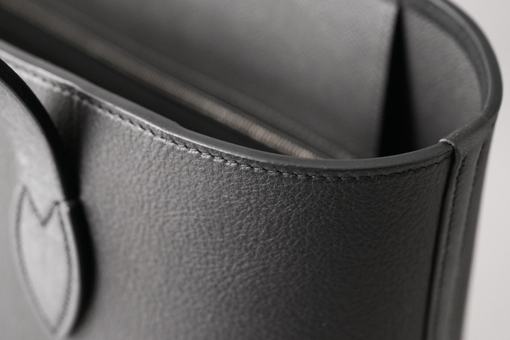 製品中最も負荷の掛かるハンドル基部は手縫いで縫製されています。ハンドルと胴部分のパーツを合わせた厚みは8mmにもなりますが、バッグの顔とも言えるような部分のために細かいピッチで仕上げられており、ドレスシューズとの親和性を図った意匠になっています。