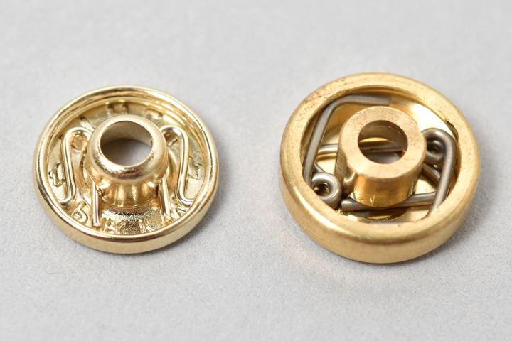 一般的なホックは画像左のように板状の金属をプレス加工して製作されますが、今回使用している画像右のホックは金属の塊を切削して作られた”挽物”になります。