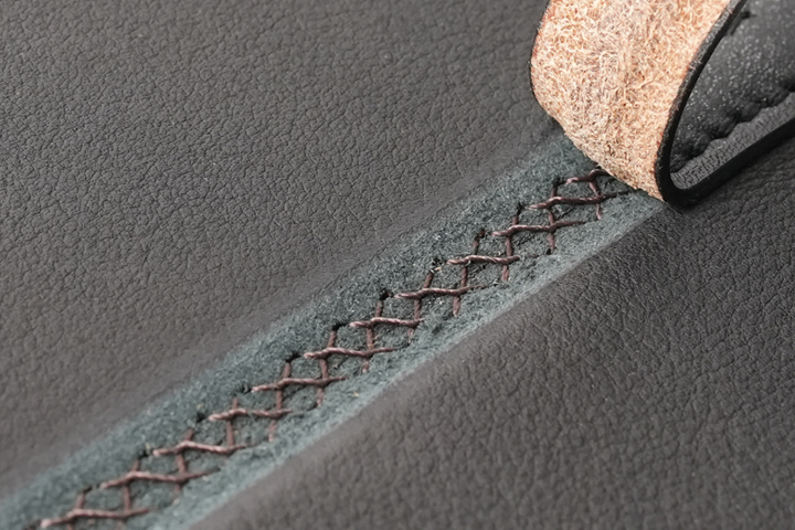 革同士を縫い付けているのではなく、縫製同士をもう一本の糸で締め込んでいるという革巻きのステアリングのような方法で繋ぎ合わせています。