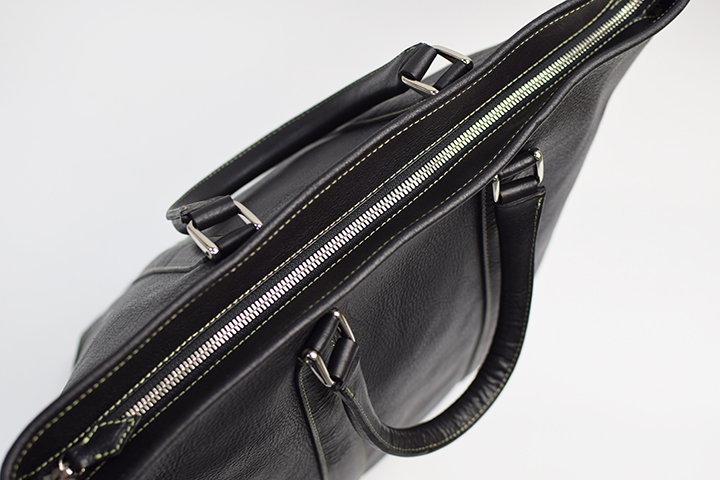 一般的に日本では伸びやすいベリー部分を含みつつ、革を背中で縦方向に割る半裁の方式を採用しておりますが、今回のSDステアは国内では初めての試みとして、ショルダーとバットからベリーのみを切り落とす裁断方式を取り入れ、鞄に適した革だけを製作に用いることが可能となりました。