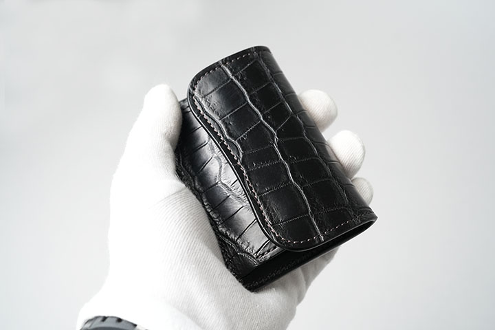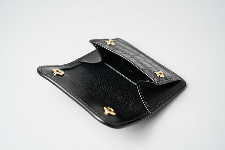 改めて今回ご紹介するTONGUEの「特別」な部分について触れていきます。通常、コインケースの前身部分はサドルプルアップをはじめとした牛革があしらわれますが、特別仕様では、この前身部分においてもブラックのクロコダイルが採用されています。小さなパーツではありますが、こちらもクロコダイルになると製品全体の重厚感が増します。また、ブラックの皮革部分とゴールドのカラーのホックのコントラストは高級感を演出します。