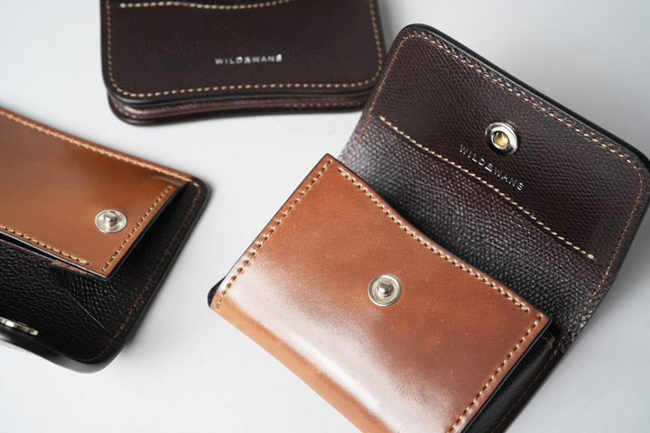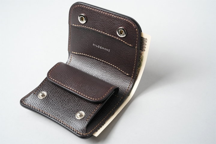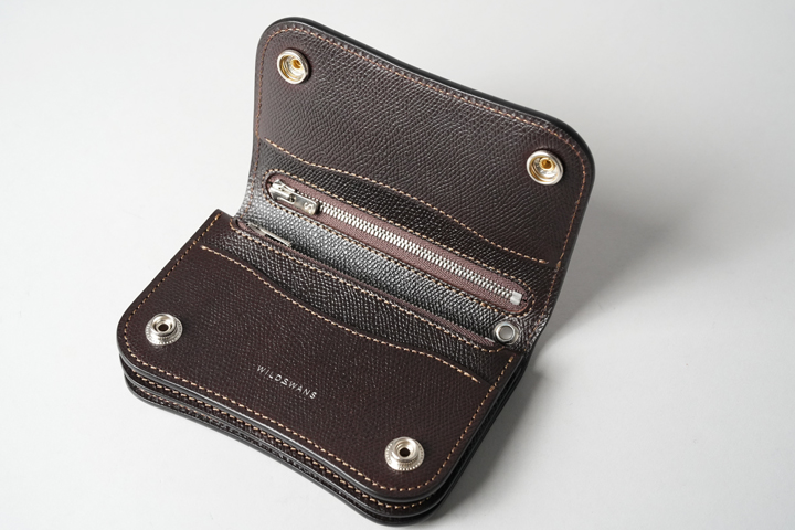 WILDSWANSを代表するコインケースです。内装には仕切りが備わり、小銭とカード、紙幣を分けて収納できます。シルバーのロゴはこのパーツに刻印されています。