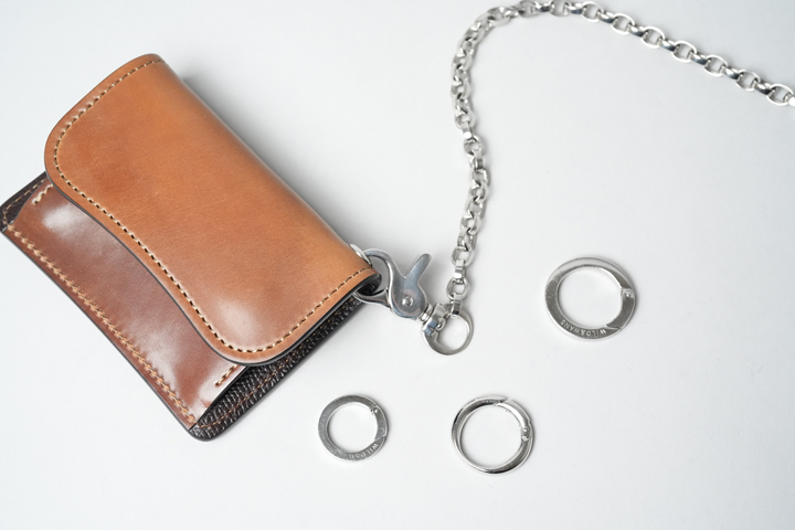 万能型のTONGUEにハトメが備わることで、飛躍的に携帯性が向上します。WILDSWANS製品ですと、カラビナキーリング(S)・(M)、ラウンドカラビナキーリング、ウォレットチェーンの装着が可能です。