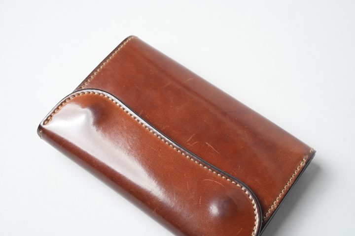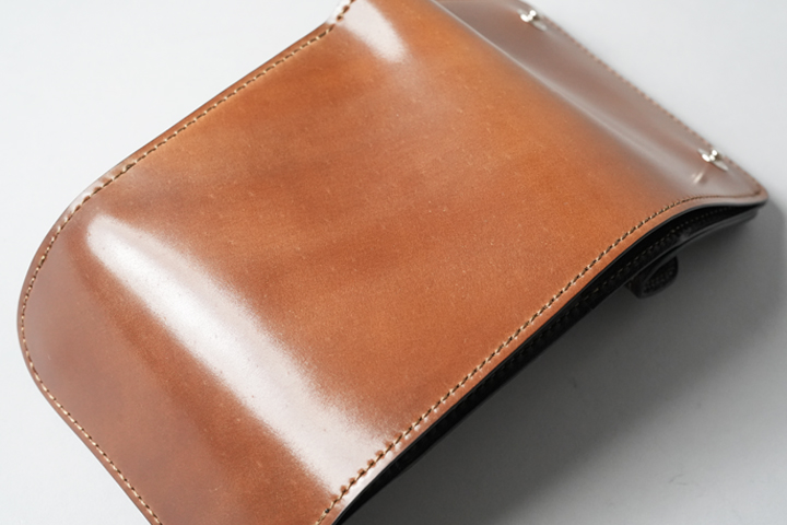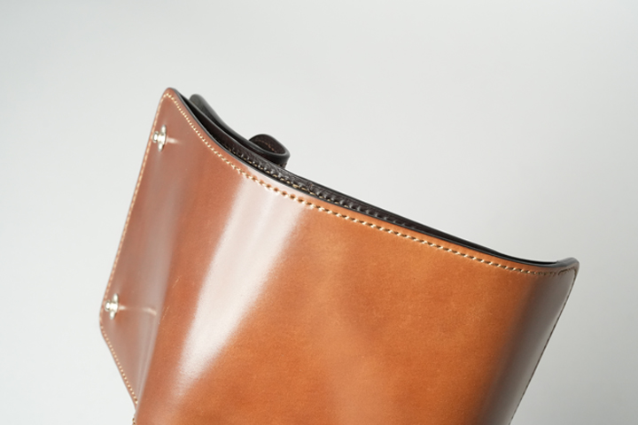 外装は一枚革のシェルコードバンで形成され、つるりとした質感をダイレクトに感じていただけます。フラップに留め具はありませんが、使用とともに皮革が馴染むことで、次第にぴったりと閉じるようになってまいります。