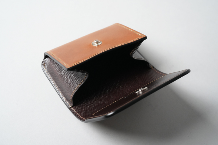コインケースのフラップを可動式につくることで、フラップと仕切りを兼ねた役割を果たします。カード類はフラップの背面側への収納を想定しており、10枚前後の収納が可能です。