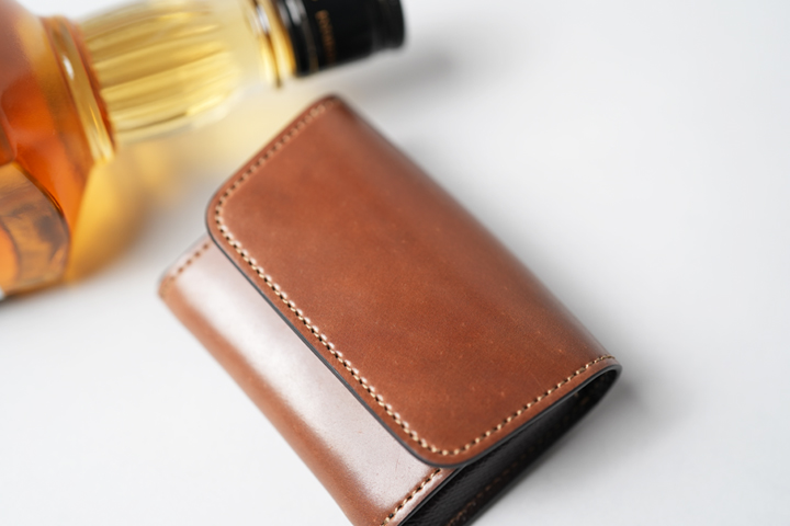 さて、今回は繊細な琥珀色が美しいバーボンをご用意しました。色味が比較的明るいことと、皮革の風合いを最大限に生かしているがゆえに皮革由来のシミ、キズ、毛穴などがはっきりと残る部位も見られ、さらにシェルコードバン特有の色ブレによる濃淡の個体差も生じます。そういった意味でも繊細と表現できるカラーですが、逆に言えば馬の革本来の風合いを存分に楽しめる、いわゆる育て甲斐のあるカラーと言えるでしょう。
