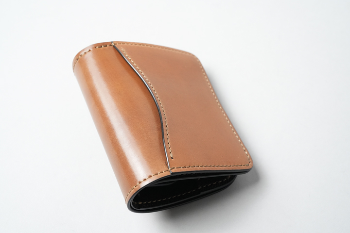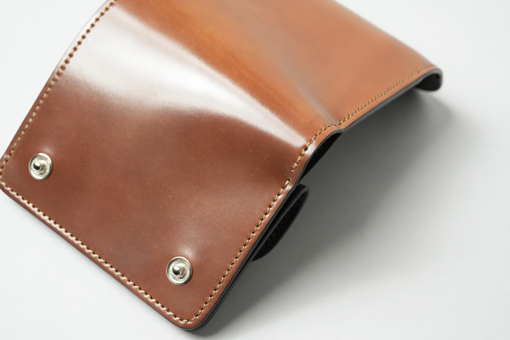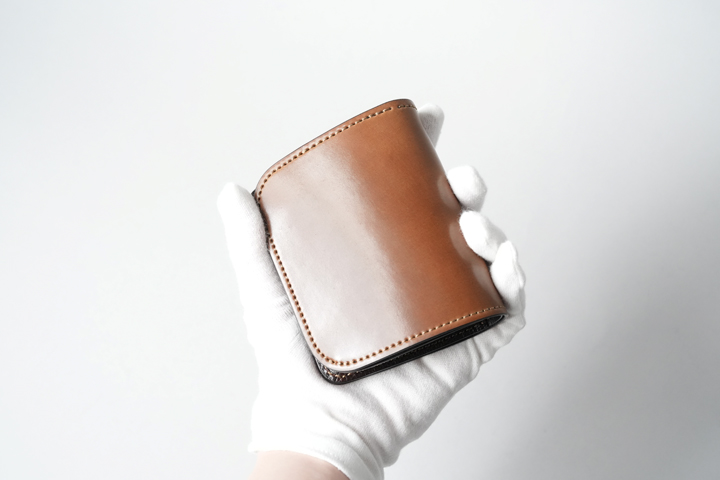 一枚革のシェルコードバンを大胆に使ったENO。折り曲がり部分に逆反りのシワが生じにくいのは、シェルコードバンの特性の一つです。