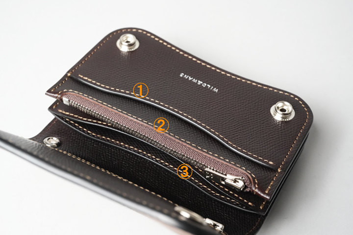 ③ ・・・ファスナー式コインケース。ファスナーはYKKのエクセラを採用しています。