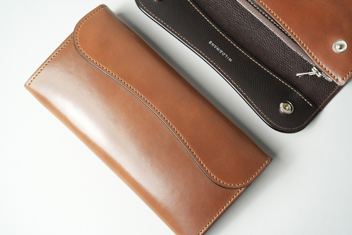 こちらも一枚革のシェルコードバンを使った贅沢なアイテム、大型長財布のWAVEです。シルバーのロゴは、内装のバネホック間に刻印されています。