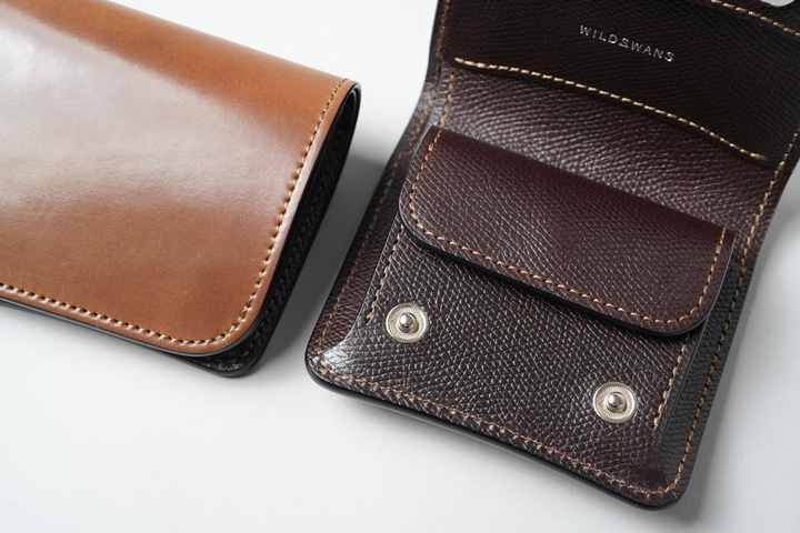 シェルコードバンを手掛けるのは、アメリカのイリノイ州シカゴで100年以上の歴史を持つ伝統的なタンナー、ホーウィン社(Horween Leather Co.)。一般に馬の臀部の繊維層を削りだした皮革をコードバンと呼びますが、ホーウィン社が生み出すそれは「シェルコードバン」と呼ばれています。大手紳士靴ブランドをはじめ、名だたるメゾンで愛される圧倒的なクオリティ、それに対する自信に裏打ちされた唯一無二の呼称は、最高峰のコードバン革として世界に名を轟かせています。絹のように滑らかな肌触りと強い光沢はファンを魅了してやまず、WILDSWANSでも絶大な人気を誇る銘革です。