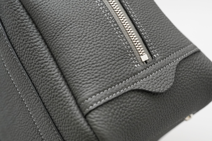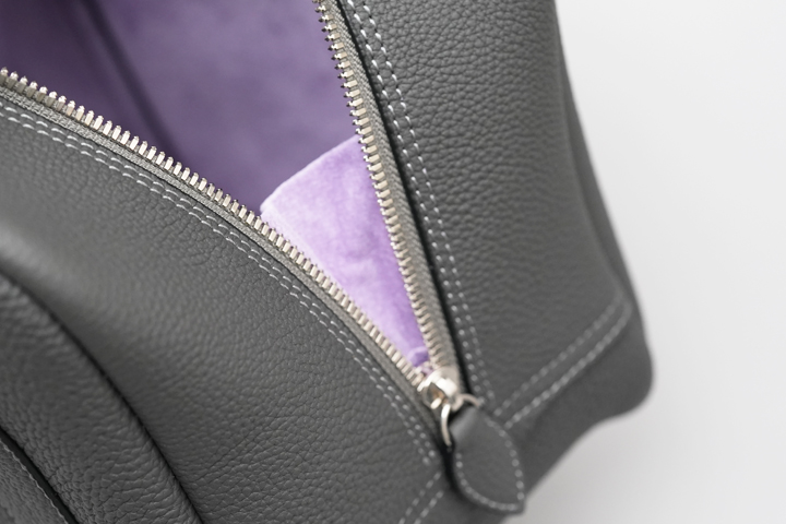 収納部のファスナーはダブルファスナーで利き手や向きに関わらず開閉がし易く、また引手にもメイン素材同様にシュランケンカーフがあしらわれており、手袋などをお召しのままでも開閉はスムーズです。