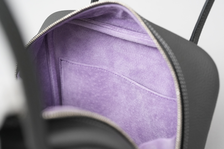 メイン収納部はピッグスエードを貼り込んだ贅沢な内装で、仕切りの無い1室構造となっています。