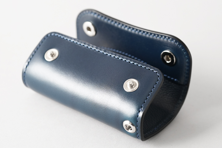 本体は継ぎ目の無い一枚革がぐるりと一周しており、2点のホックで留められています。