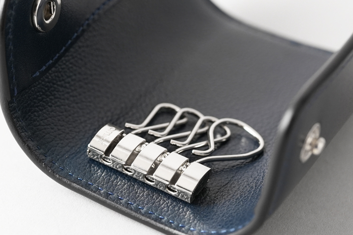 フラップを開いた内装の中央にはキーフック金具が付属します。 フックは4連になっており、そのうちの1つは大きなフックのために大きな鍵や特殊な形状の鍵等も取り付けることが出来ます。