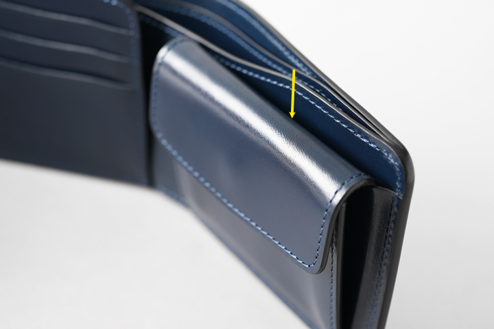 コインケースはフラップ式で、左右にはマチを設けた容量の豊富なケースです。 ケース内部は革の床面を活かしたデザインになっています。