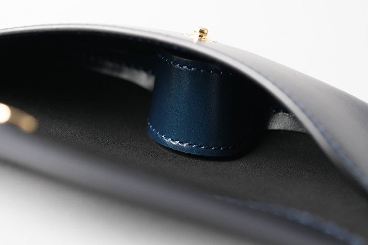 フラップの裏側、ロゴが刻印されているパーツはポケット状になっており、小ぶりな眼鏡拭きなどを収めておくことが出来ます。