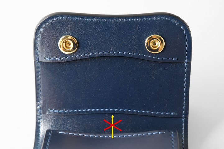 ※ホックが1点のため、革のハリやクセなどによってフラップを閉じた状態でフラップが僅かにずれて水平にならない可能性がございます。