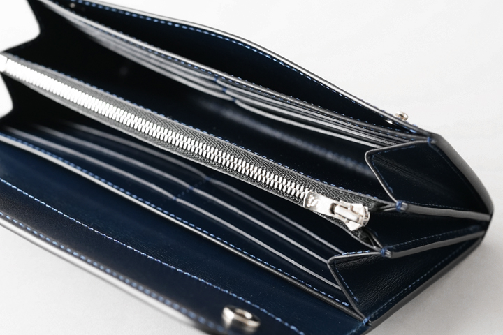 名刺やカード類は大きく開いたマチ部分の奥側に収納します。